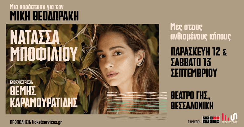 ΜΙΑ ΠΑΡΑΣΤΑΣΗ ΓΙΑ ΤΟΝ ΜΙΚΗ ΘΕΟΔΩΡΑΚΗ «Μες στους ανθισμένους κήπους» ΝΑΤΑΣΣΑ ΜΠΟΦΙΛΙΟΥ Ενορχήστρωση: ΘΕΜΗΣ ΚΑΡΑΜΟΥΡΑΤΙΔΗΣ Το αφιέρωμα που συγκλόνισε την Αθήνα έρχεται στη Θεσσαλονίκη για 2 μόνο παραστάσεις! Παρασκευή 12 & Σάββατο 13 Σεπτεμβρίου Θέατρο Γης, Θεσσαλονίκη Μετά από τα 3
