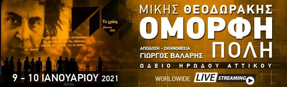 Η «ΟΜΟΡΦΗ ΠΟΛΗ» του Μίκη Θεοδωράκη σε απόδοση-σκηνοθεσία Γιώργου Βάλαρη, η θεατρική – μουσική υπερπαραγωγή της χρονιάς, που υμνήθηκε από κοινό και κριτικούς, μετά από τις sold out παραστάσεις στο Μέγαρο Μουσικής Αθηνών – Θεσσαλονίκης και στο Ηρώδειο, θα προβληθεί διαδικτυακά σε online streaming – worldwide από το Ηρώδειο, μόνο για δύο ημέρες στις 9 και 10 Ιανουαρίου, μέσω της πλατφόρμας του VIVA.GR, ώστε να την απολαύσει όλος ο κόσμος τόσο στην Ελλάδα όσο και στο εξωτερικό.