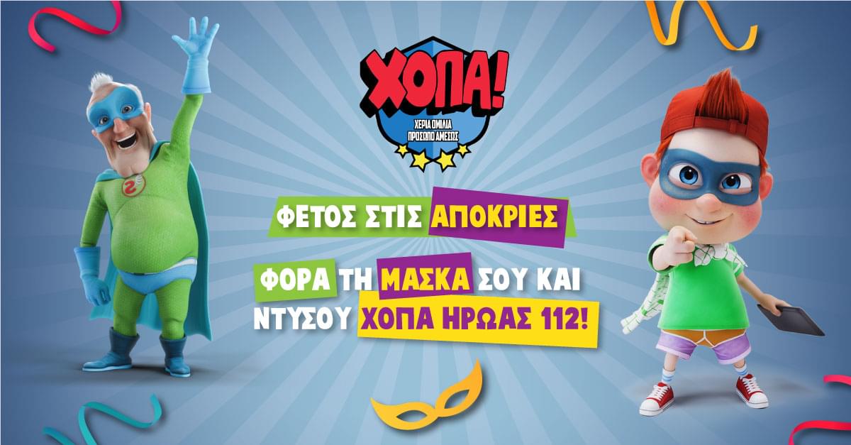 Το φετινό καρναβάλι θα είναι σίγουρα διαφορετικό, χωρίς μαζικές παρελάσεις σε δρόμους και μεγάλα αποκριάτικα party.  Φέτος όμως μπορούμε να κάνουμε τη διαφορά και φορώντας την αποκριάτικη μάσκα μας από το σπίτι μας να σώσουμε ζωές! Πώς; Με καρναβαλίστικη διάθεση και αποκριάτικο κέφι, θα συμβάλλουμε στη διάδοση της παγκόσμιας καμπάνιας «Χ.Ο.Π.Α. (Χέρι-Ομιλία-Πρόσωπο-Αμέσως)  Ήρωες 112 που σώζει ζωές!