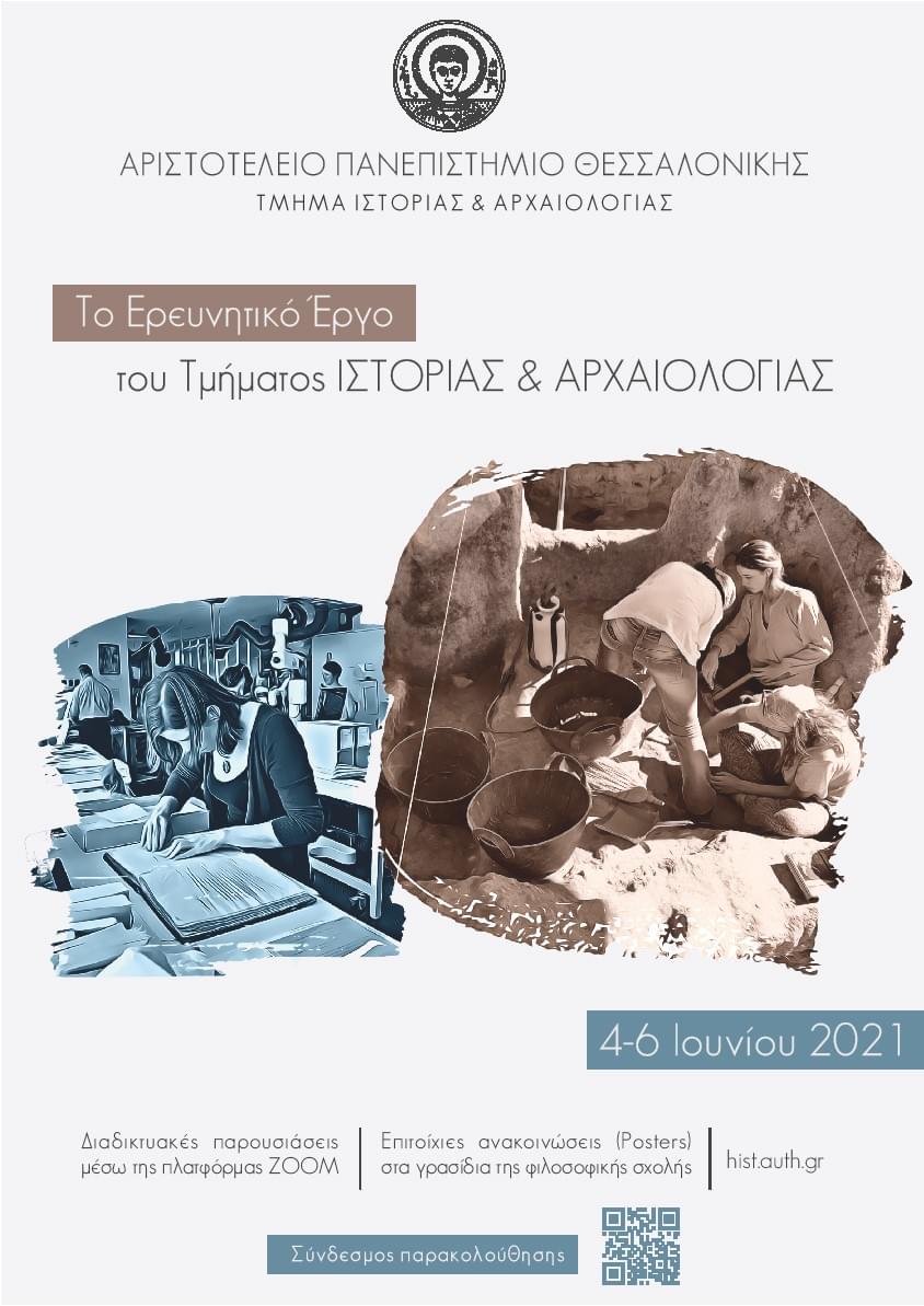 Το Τμήμα Ιστορίας και Αρχαιολογίας ΑΠΘ διοργανώνει στις 4-6 Ιουνίου 2021 εκδήλωση για να αναδείξει το ερευνητικό έργο των τελευταίων ετών, που πραγματοποιείται από μέλη ΔΕΠ, ΕΔΙΠ, ομότιμους καθηγητές, μεταπτυχιακούς φοιτητές, υποψήφιους διδάκτορες και μεταδιδάκτορες.
