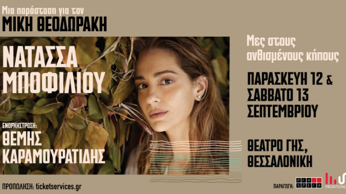 100 χρόνια συμπληρώνονται φέτος από τη γέννηση του σπουδαίου συνθέτη και εμβληματικού δημιουργού Μίκη Θεοδωράκη και η Νατάσσα Μποφίλιου σε ενορχηστρώσεις Θέμη Καραμουρατίδη, παρουσιάζει για πρώτη φορά στη Θεσσαλονίκη το αφιέρωμα «Μες στους ανθισμένους κήπους» σε σύλληψη και καλλιτεχνική διεύθυνση της ίδιας και σκηνοθεσία Άγγελου Τριανταφύλλου.